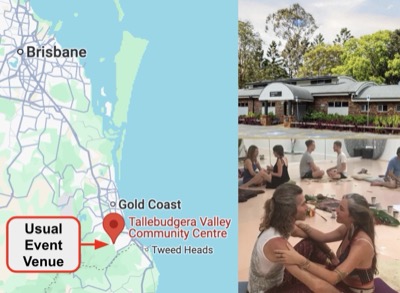 What:White tantra event ...often with cuddle puddle at the end. When:Approximately once a month, usually on a Friday from ~7:30 pm – 11:30 pm ... check the (calendar) Where:Tallebudgera Valley Community Hall, 611 Tallebudgera Creek Rd, Tallebudgera Valley ... (map) Cost:~$55 book online ... 55 is an early bird ticket. What to wear:Comfortable clothes ... and bring a yoga mat and pillow/blanket if you like. ;) Website:ajnatemple.org ... then visit the events page.